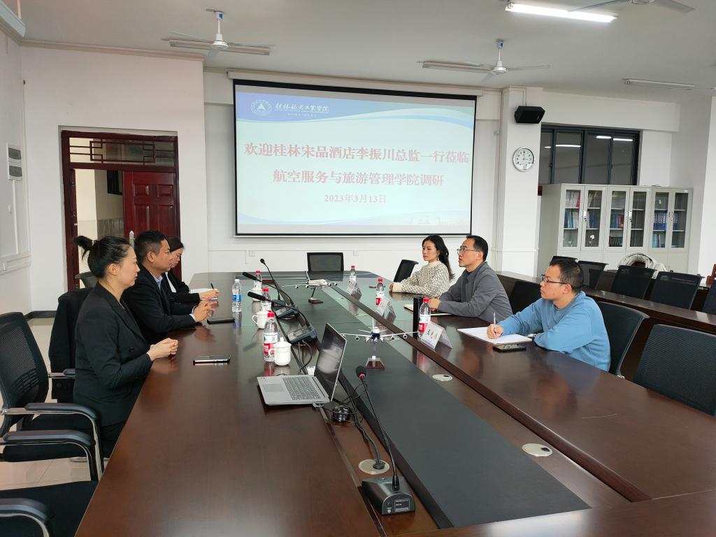 2023年3月13日桂林宋品酒店人力资源部总监李振川一行莅临公司考察交流,公司党委书记张海涛在公司会议室热情接待来访嘉宾,酒店管理教研室教师代表王光伟、任传阳出席了此次交流会。