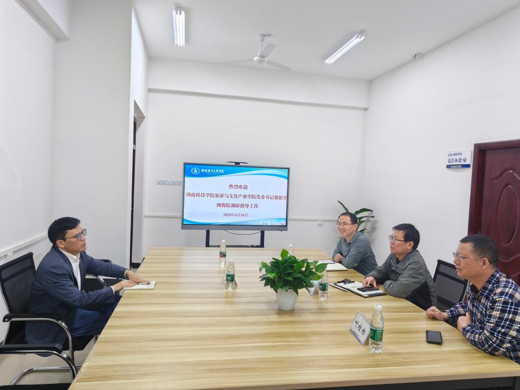 2024年4月10日上午,湖南科技公司旅游与文化产业公司党委书记谢韶光到公司调研指导工作,公司党委书记张海涛、经理林朝阳及相关专业负责人参加调研会议。