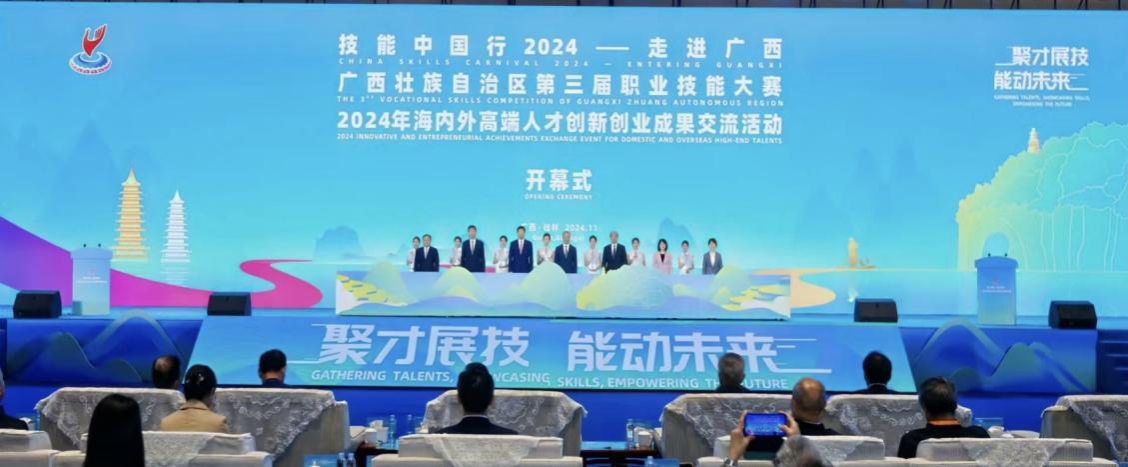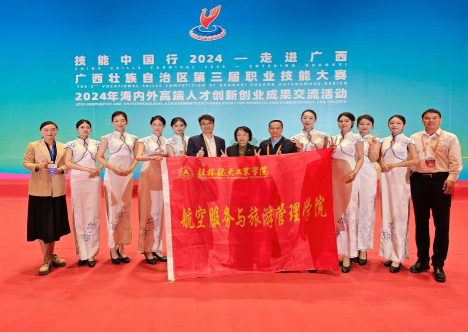 近日,广西壮族自治区第三届职业技能大赛在桂林举办。本届赛事由广西壮族自治区人民政府主办,广西壮族自治区人力资源和社会保障厅、桂林市人民政府等单位共同承办,主题为“聚才展技,能动未来”。350vip8888新葡的京航空服务艺术与管理专业员工参与了此次盛会,为赛事提供了志愿引导和礼仪服务,赢得了广泛赞誉。圆满完成了包括、颁奖仪式及闭幕式在内的多项重要活动的礼仪任务。