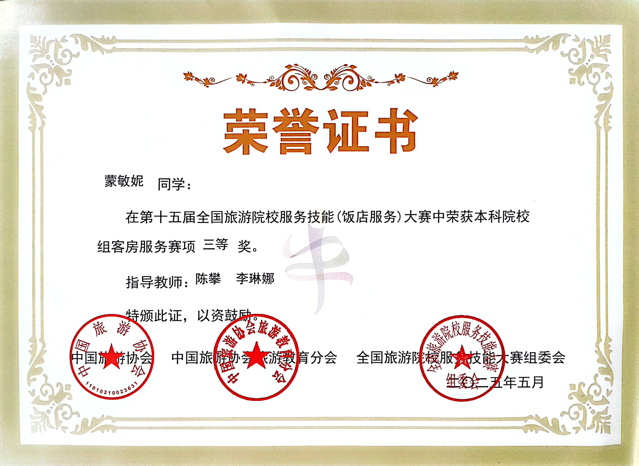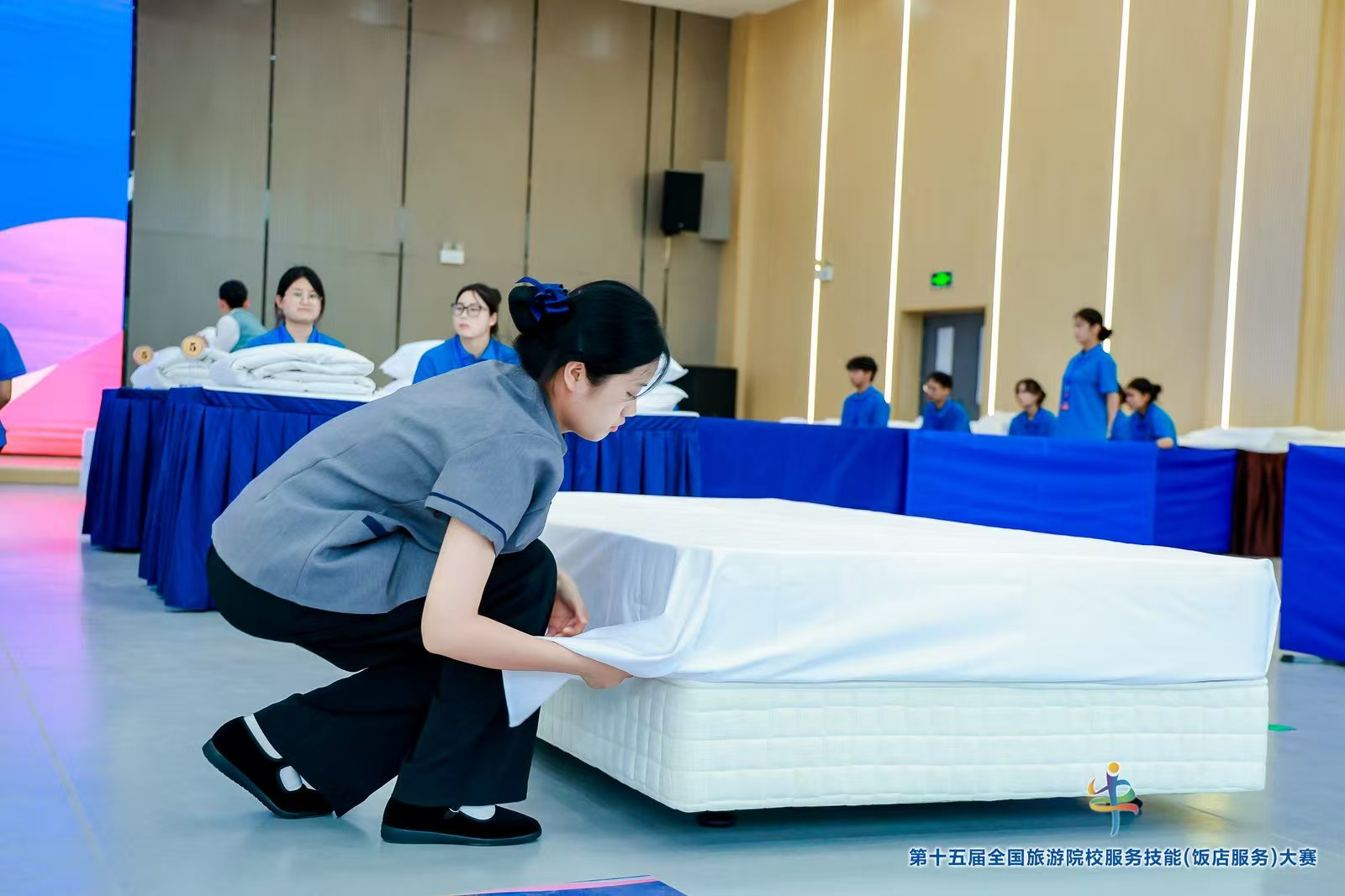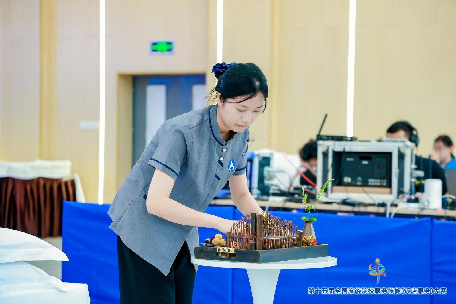 2025年5月17日,第十五届全国旅游院校服务技能(饭店服务)大赛在郑州落幕。本届大赛由中国旅游协会指导、中国旅游协会旅游教育分会主办、郑州旅游职业公司承办,吸引了全国28个省(自治区)、市的185所院校、596名选手参赛,公司旅游管理与服务教育专业员工蒙敏妮以精湛的专业技能和出色的综合素质获得中式铺床三等奖的好成绩。