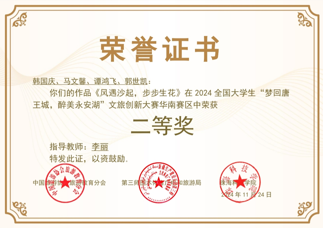 本次大赛以“赋能南疆旅游 助力文化润疆”为主题,自大赛启动以来,各院校反响热烈、积极参与,吸引了全国96所高校、338支队伍、2000余名师生报名参赛。经过2个月的前期准备和作品打磨,酒店管理专业韩国庆(团队)作品《风遇沙起,步步生花》获得二等奖,350vip8888新葡的京获得优秀组织奖。