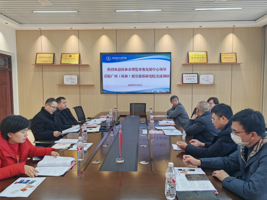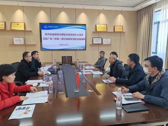 2025年1月6日上午,桂林市博览事务发展中心蔺艳超、梁代辉副主任一行与公司党委张海涛书记、广西(桂林)低空旅游研究院罗敏经理、张龙杰秘书长、梁欢欢博士等,就中国--东盟博览会旅游展区低空旅游展布展、招展、服展等工作进行了深入探讨。