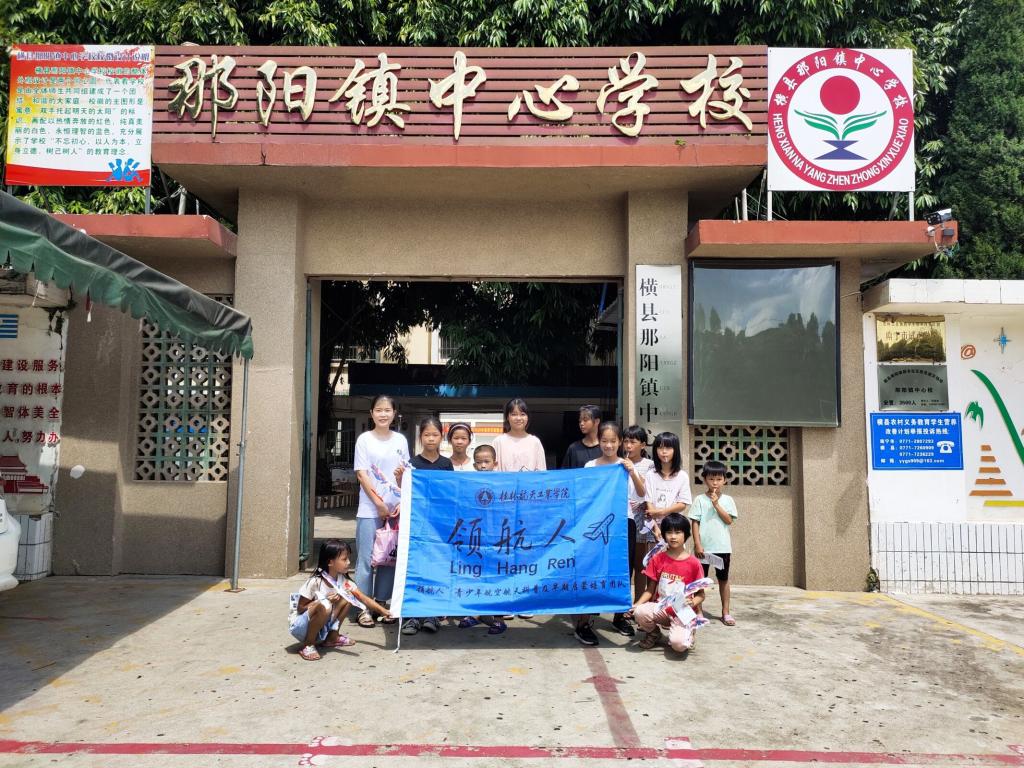在广西南宁横县的那阳镇,志愿者们选择了镇上小学作为科普宣传点,为小朋友进行航空航天科普现场教学。那阳镇位于南宁市横县的东南部,郁江南岸,南宁至梧州的西江水道郁江水系环抱镇境,是通往灵山、北海、玉林、贵港、柳州、广东等地的交通枢纽,全镇地貌半山半丘陵,这里天蓝水清,风景秀丽,气候宜人。因为距离城市较远,在现阶段的启蒙培育中,孩子们基本上接触不到航空航天类的活动,对于“中国航天日”等重要的航天纪念日也知之甚少。在这美丽乡村,志愿者们从航空航天的起源开始,为小朋友们讲述中国航天的故事,现场教小朋友们制作飞机航模,开展航天知识有奖问答。在“领航人”团队志愿者的指导和带领下,纷纷完成了各种各样飞机模型的组装,这不仅激发孩子们探索飞机等飞行器的好奇心,而且提高了动手实践能力。小飞机在空中飞扬,孩子们的快乐情绪也达到了顶点。