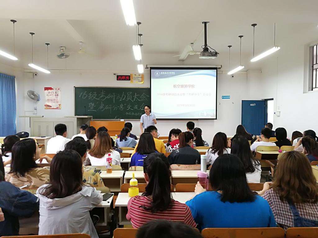 随后,酒店管理教研室王光伟老师用风趣幽默的语言与同学们分享了自己的考研心路历程,从五个方面为同学们分析了考研的优势以及考研对自我价值的提升作用,鼓励同学们“要高看自己一眼,要相信自己的实力”。航空服务教研室黄赶祥老师围绕“什么是考研”、“为什么考研”和“怎样考研”这三个关键问题进行深入浅出的讲解,用两句话点明本次会议的主旨“以他山之石攻玉”,“站在巨人的肩膀上看世界”。在最后的互动提问环节中,大家踊跃地就考研的相关事宜进行了提问,两位老师也耐心地一一作答。大会结束后,为帮助同学们更早更好地了解考研的政策和形势,有针对性的备考,公司建立了“考研帮”QQ群、考研交流微信群等互动交流平台,以便日后大家在考研方面能有更进一步的交流。