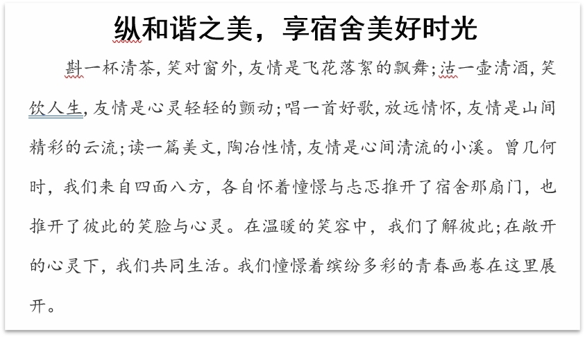 豪墨书写友情,勾勒宿舍的温情。征文比赛中,同学们将宿舍周边发生的好事、乐事、趣事,两个月来发生的点滴在字字句句中反应出团结互助的亲情、友情。