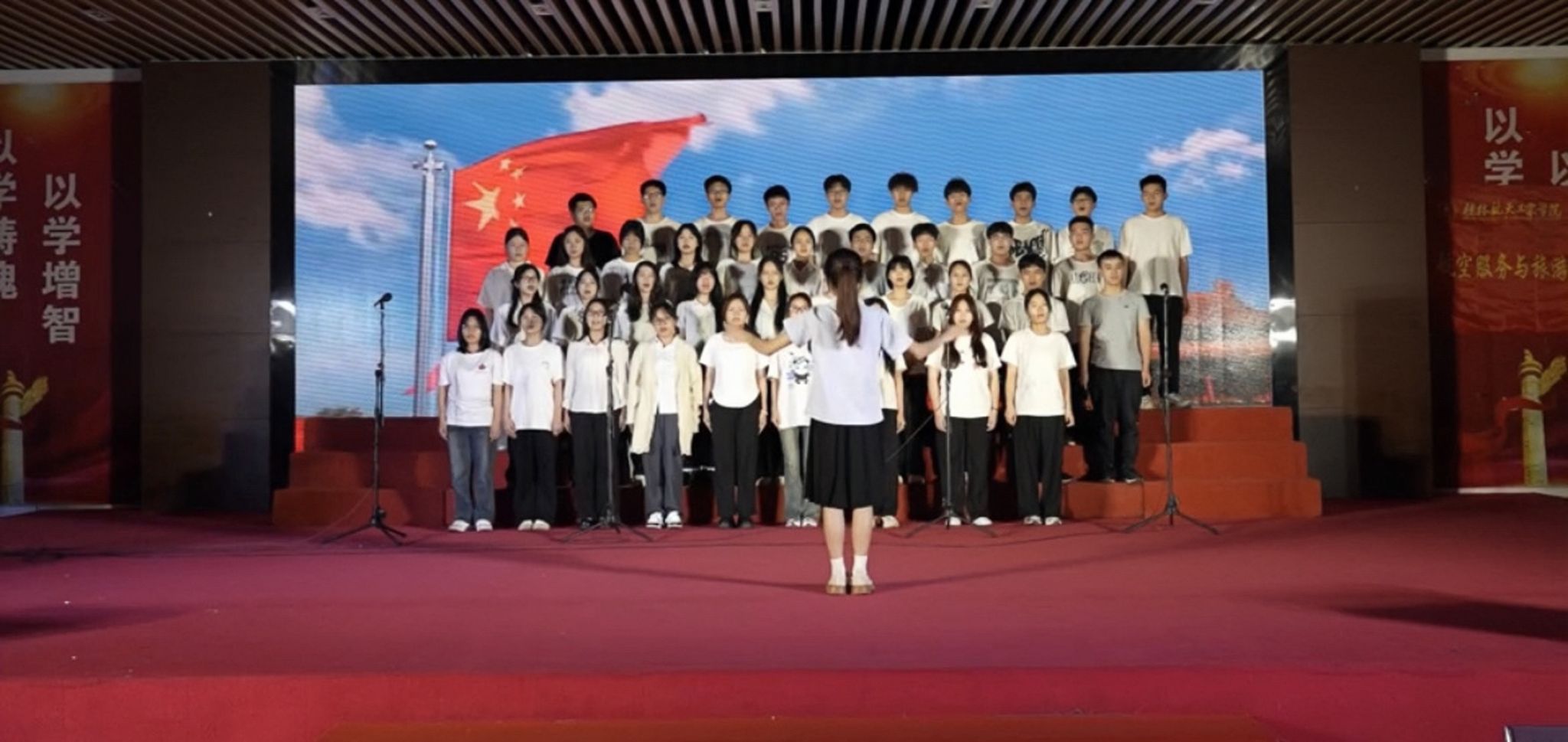 本次合唱比赛共有八支队伍冲出重围进入决赛,并分为探天组和飞天组两个组别,每组四支队伍,以确保合唱比赛决赛公平合理的进行,同学们齐心协力,为此次比赛筹备许久,有的班级身着专业的空乘机组服装,热情开朗;有的班级身着整齐划一的白衬衫,青春洋溢;有的班级身着复古的民国员工服,怀旧经典。全体参赛同学们身着精心准备的服饰登上舞台,通过舞台效果给观众们带来耳目一新的视听盛宴。