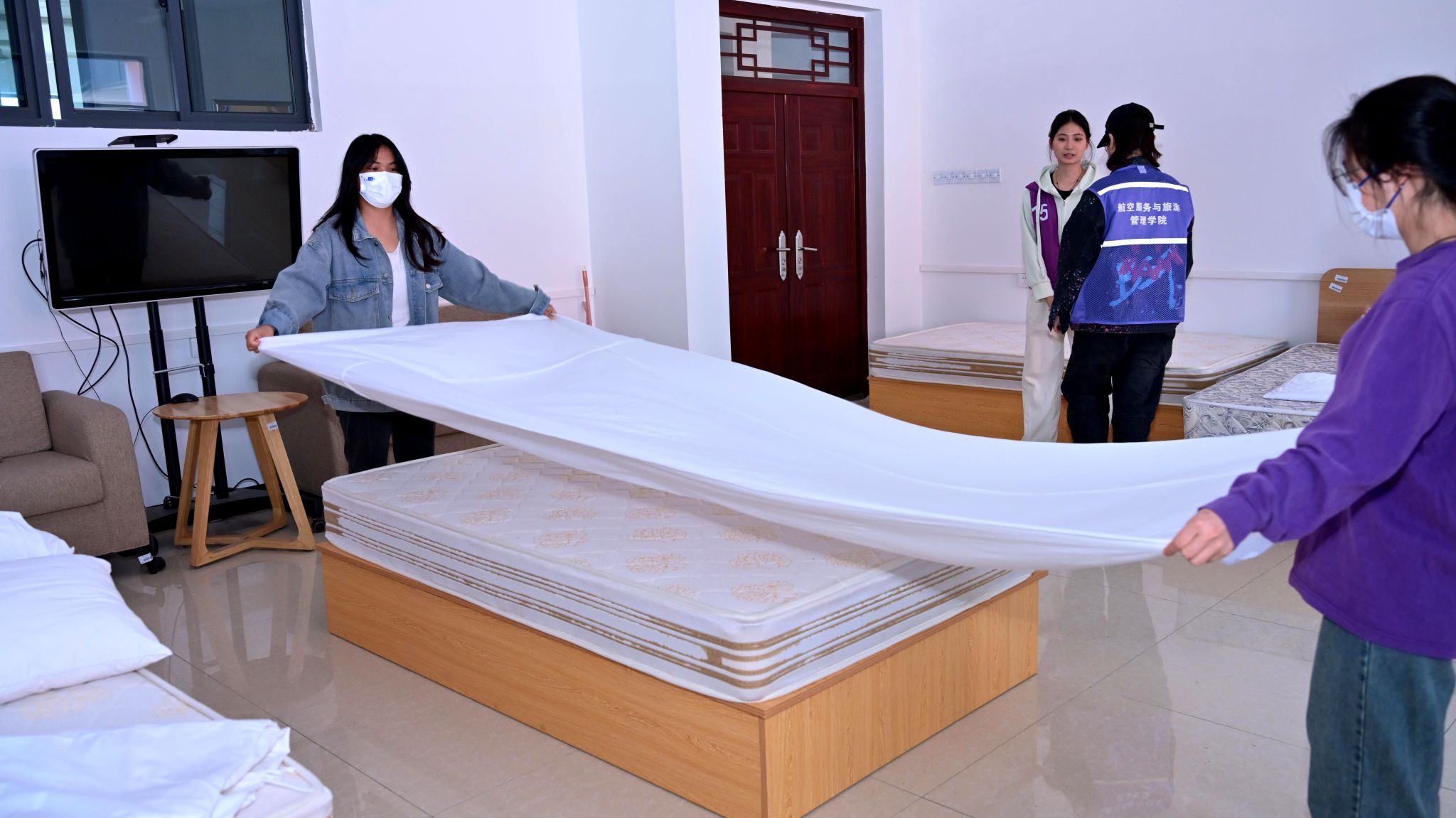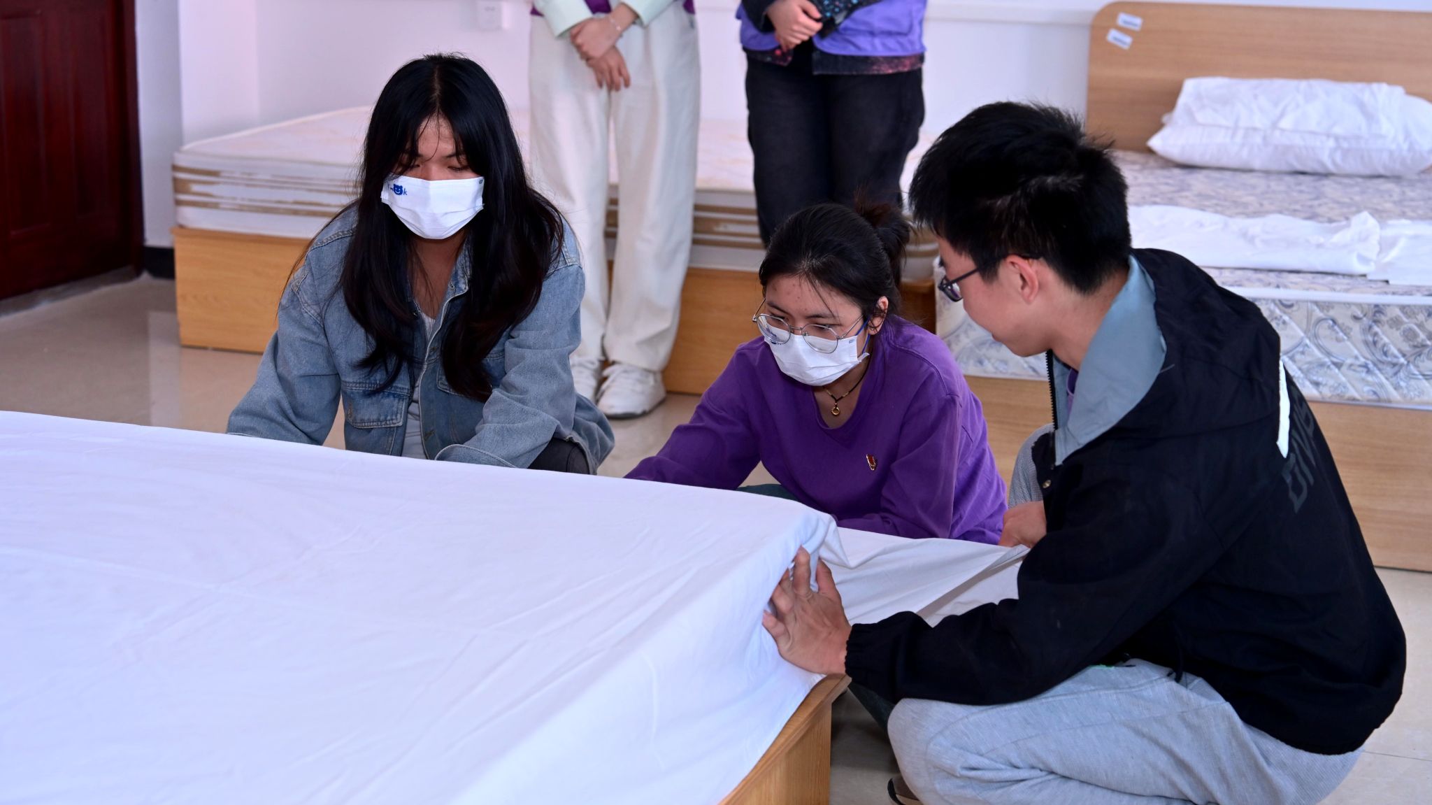 酒店管理专业则聚焦“客房床单服务技能”,全方位展现专业精细化操作。员工代表现场展示了快速铺床技巧,甩单、包角等动作娴熟流畅,最终呈现出平整挺括的床单效果。在实操环节,同学们积极踊跃参与,在不断调整动作的过程中,切实体会到铺床工作对尺寸把控、动作速度的严格要求。不少同学在实操后表示,深刻感受到了酒店管理专业对效率与细节的高标准、严要求。
