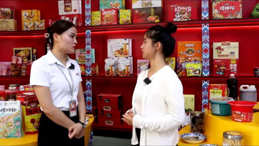 “欢迎大家来到‘佳味螺’,‘正宗螺蛳粉,有螺才地道’‘地道螺蛳粉,鲜辣酸爽烫’,这是佳味螺螺蛳粉的口号,也是螺蛳粉的灵魂所在。大家可以看到这是我们公司推出的一些螺蛳粉产品。”讲解员带领团队进入螺蛳粉展厅,花生、腐竹、木耳、螺蛳饭、螺丝鸭脚煲……螺蛳粉的各种原材料以及螺蛳粉的相关产品应有尽有。