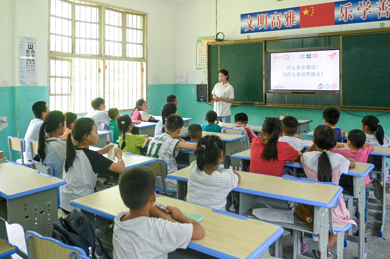 公司“赴灌阳推普助力乡村振兴”老员工暑假社会实践志愿服务活动团队在桂林市灌阳县新圩镇解放村进行普通话推广活动。团队以趣味推普课程为起点,深入基层走访调查,全面调研边远民族地区普通话普及应用情况。