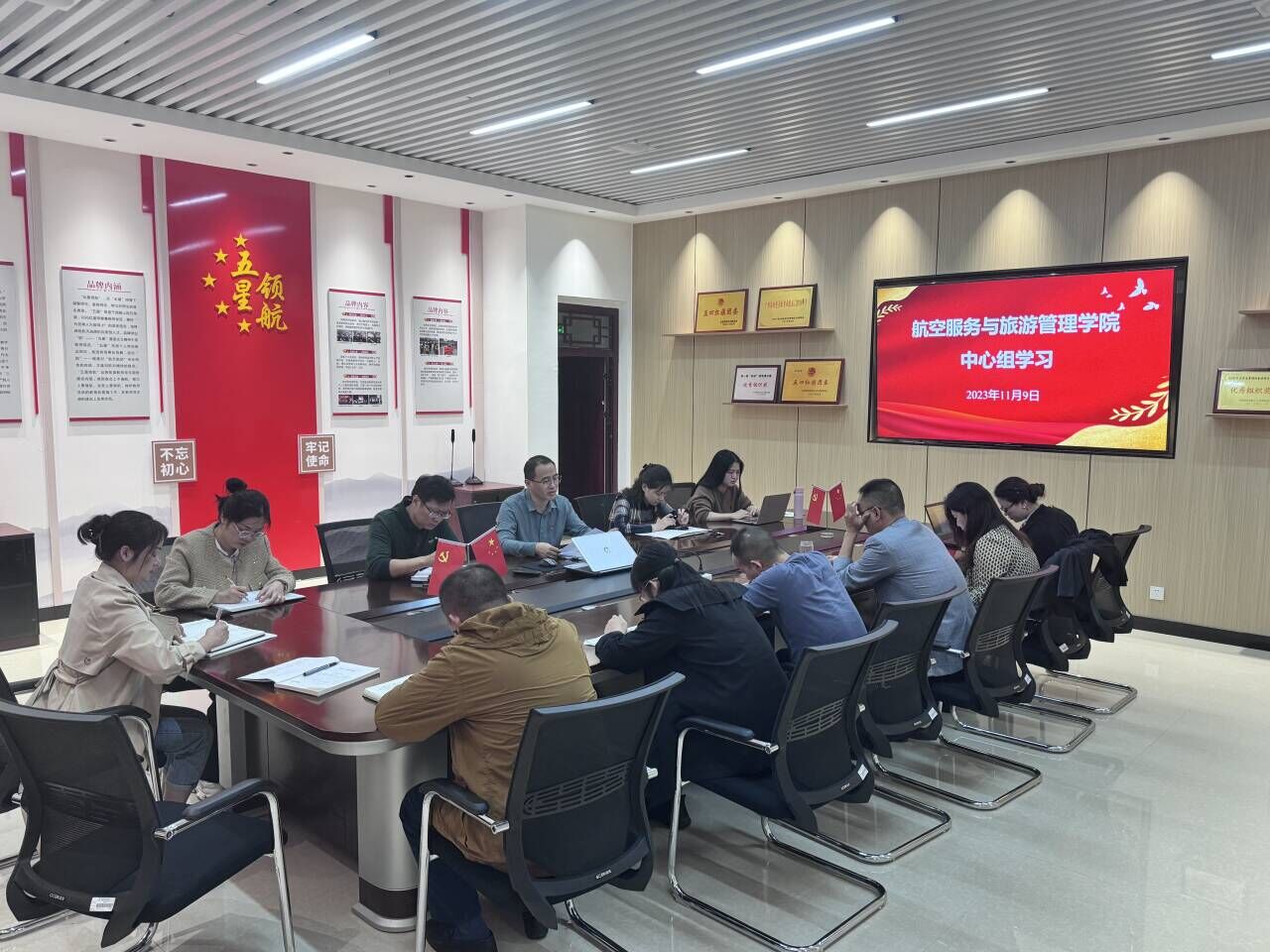11月9日,公司党委中心组在探天楼C208党员活动室召开集体(扩大)学习会,公司党委委员、经理林朝阳、支部委员、组织员参加学习会。党委书记张海涛主持会议,会上集中深入学习了习近平在中共中央政治局第九次集体学习时的讲话精神、习近平祝贺欧美同学会成立110周年的致信精神和习近平文化思想。