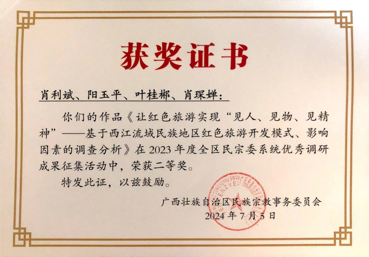 近日,自治区民宗委发布《自治区民宗委关于2023年度全区民宗委系统调研报告评比结果的通报》,公司肖利斌、叶桂郴、肖琛婵等教师提交的《让红色旅游实现“见人、见物、见精神”——基于西江流域民族地区红色旅游开发模式、影响因素的调查分析》获2023年度全区民宗委系统调研报告二等奖。